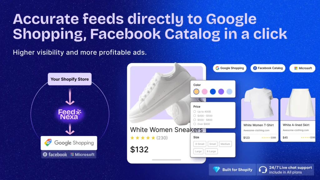 FeedNexa is a flexible and affordable feed management app for Shopify merchants looking to publish their product listings across platforms like Google Shopping, Bing, and Facebook. Whether you’re a beginner with under 500 products or a large merchant managing thousands, FeedNexa offers a pricing model that scales with your business — plus 24/7 live support to back it all up.